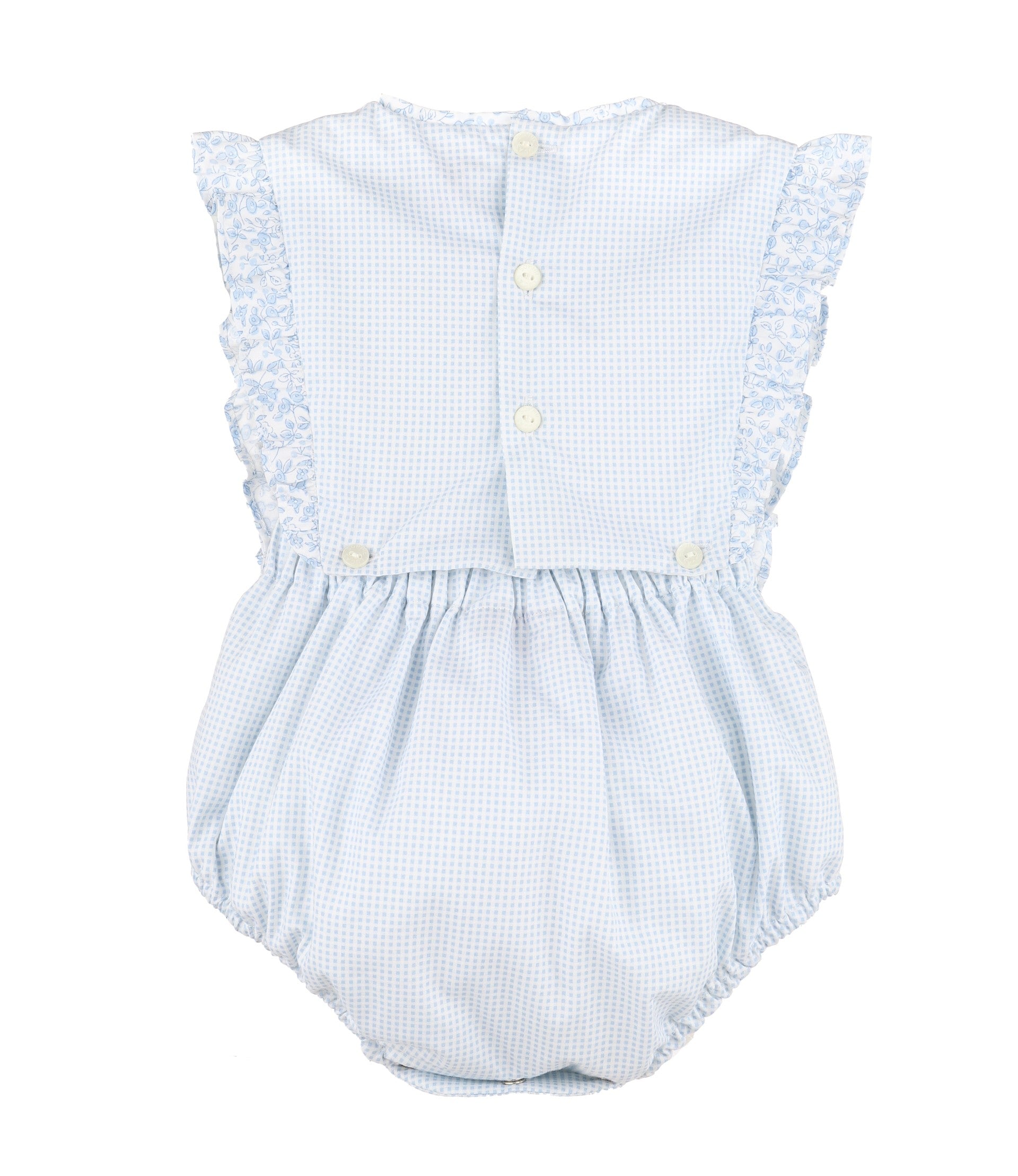 Sweet and timeless, this baby bubble features soft light blue gingham with delicate floral trim and statement bows at the waist. Designed with ruffle sleeves, elastic leg openings, and snap closures for easy changes, it’s perfect for playdates, portraits, and special moments alike. A classic silhouette with charming details you’ll love season after season.