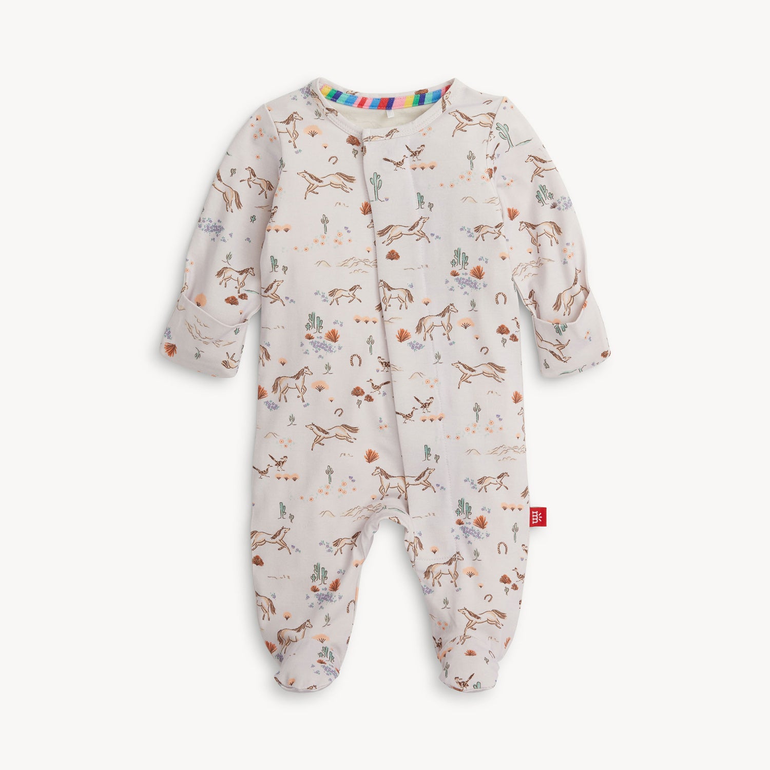 Born to Run Magnetic Me footie is made for little cowgirls with big dreams. Featuring a playful Western-inspired print in soft, feminine tones, this one-piece is as cute as it is convenient. The silky-smooth fabric is gentle on baby’s skin, while the magnetic closure makes diaper changes quicker than a gallop across the prairie. Whether she's napping or wrangling cuddles, she'll be comfy, cozy, and downright adorable.
