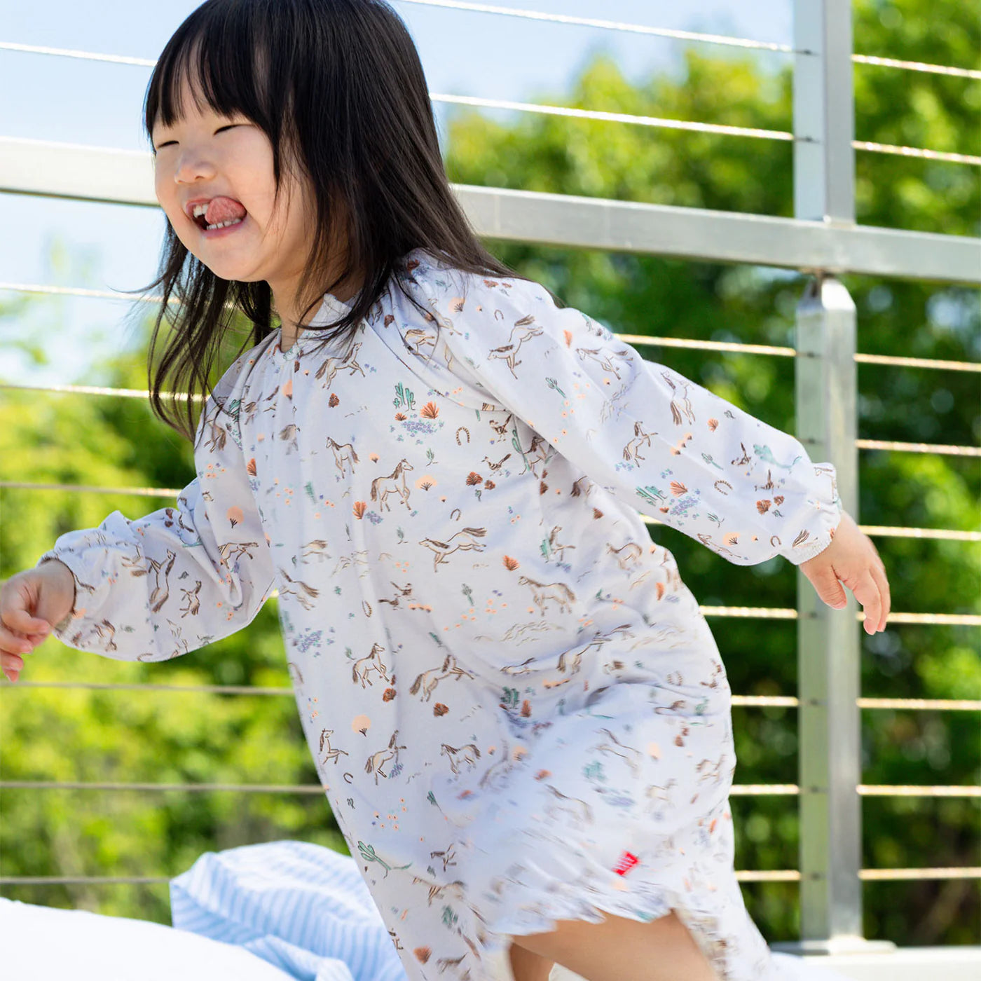 Born to Run magnetic gown is perfect for tiny dreamers with a wild spirit. Featuring the same darling Western print as the footie, this gown is made from buttery-soft, breathable modal that keeps baby cozy all night long. The magnetic closures make midnight diaper changes a breeze, and the open bottom allows for easy access while keeping her snug and warm. Finished with fold-over mittens for extra coziness, it’s a bedtime must-have for your little rodeo queen.