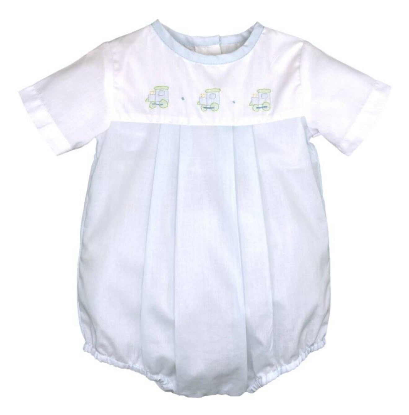 Precious newborn train romper by Petit Ami. This pleated bubble outfit for baby boy in pale blue features white bib style collar with embroidered train design. Train romper is made of fine woven poly/cotton fabric for durability, has short sleeves and snaps between the legs for easy changing.