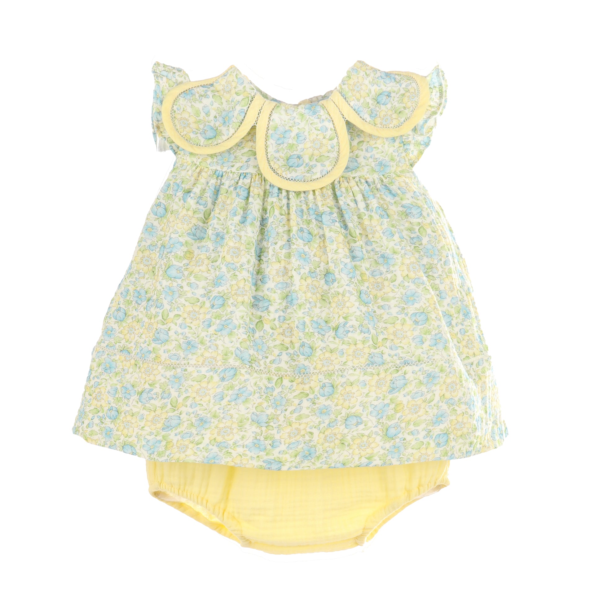 A darling two-piece set in a soft yellow and blue floral print. Designed with a scalloped collar and matching bloomers for the sweetest finish. Classic, lightweight, and perfect for sunny days.