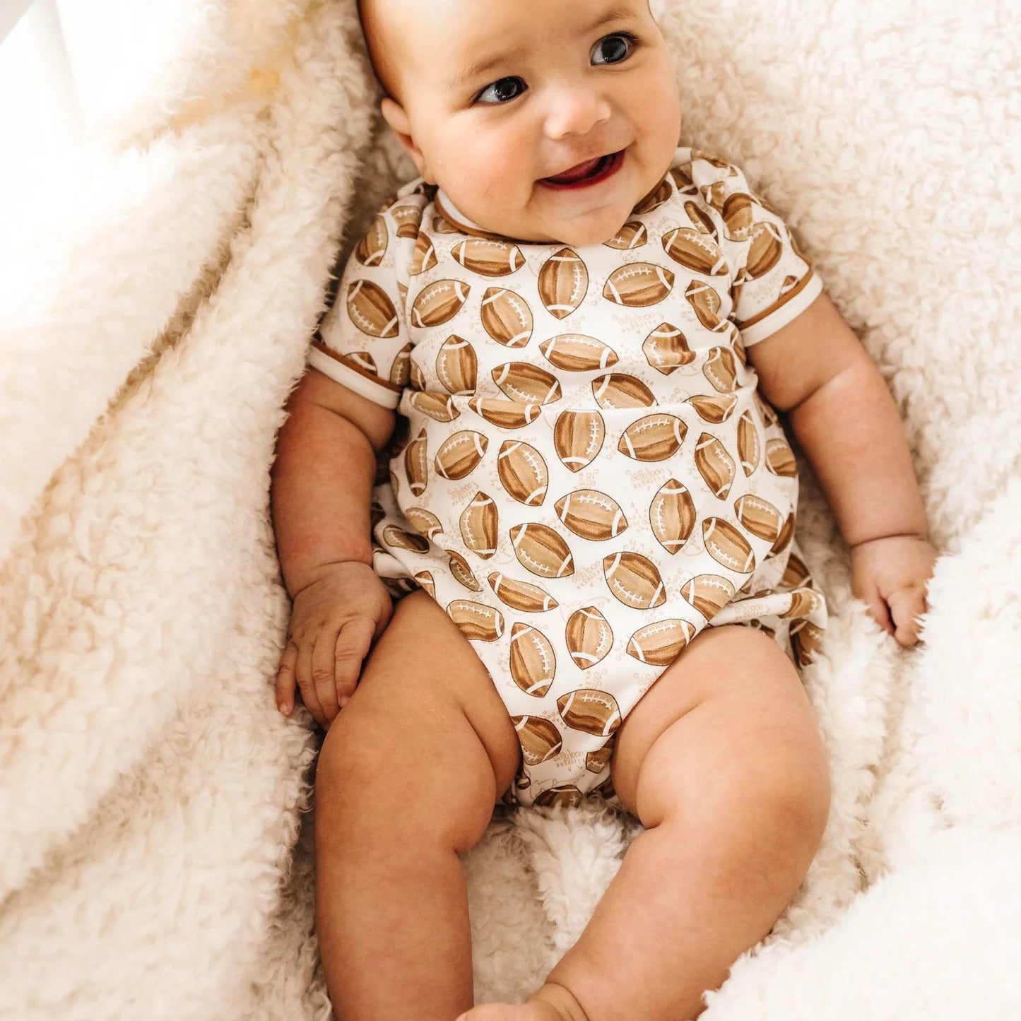 This cozy short-sleeve bubble is a perfect piece for your little one. Made from soft Pima Cotton, it features a full print of footballs and convenient snaps at the bottom for easy changes.