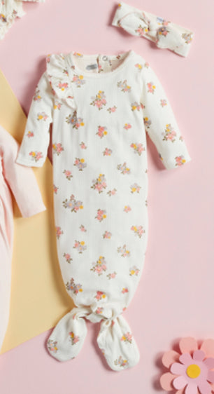 The Pointelle Sleeper Gown Set is a charming 2-piece ensemble designed for the utmost comfort and style for your little one. The sleep gown features delicate pointelle fabric, adding a touch of elegance with its intricate pattern. Enhanced with a sweet ruffle detail, this gown offers both a cozy fit and a fashionable look. Accompanying the gown is a coordinating bow headband, perfectly sized for infants aged 0-3 months, completing the adorable outfit. Crafted from a soft and breathable blend of 69% Rayon, 26% Cotton, and 5% Spandex, this set ensures gentle comfort against your baby's skin while allowing for easy movement. Ideal for both sleep and lounging, this set combines practicality with a delightful design.