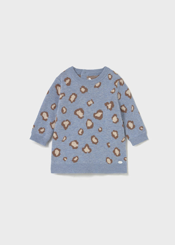 Long sleeved Dress for newborn baby girl. Round neckline. Button fastenings down the back to allow the garment to be put on and taken off easily. Knitted fabric, soft and pleasant to the touch. Patterned design.