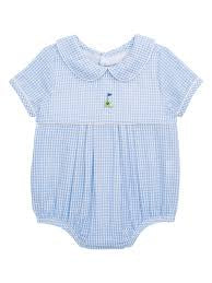 Mud Pie Blue Golf Bubble, a charming infant romper featuring a light blue gingham check pattern, a Peter Pan collar with white piping, and a small embroidered golf applique.