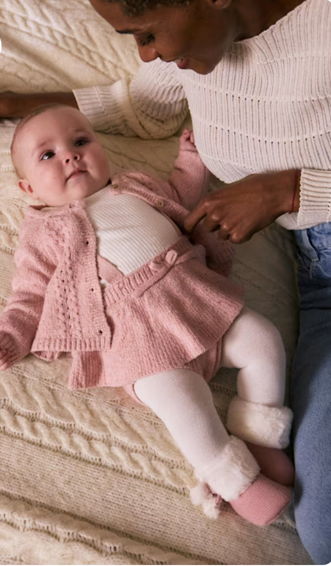 Original three-piece set for newborn girls. Made from soft and pleasant-to-the-touch knit fabric. Long-sleeved cardigan for newborn girls. Round neckline. Front button fastening. Decorative details: openwork patterns and ribbed trims. Long-sleeved T-shirt for newborn girls with elasticated cuffs. Snap-button fastening at the back. Terry-style fabric. Bloomer-style shorts that perfectly complete a charming look for your baby. This set comes in a Newborn gift box ideal for special occasions.
