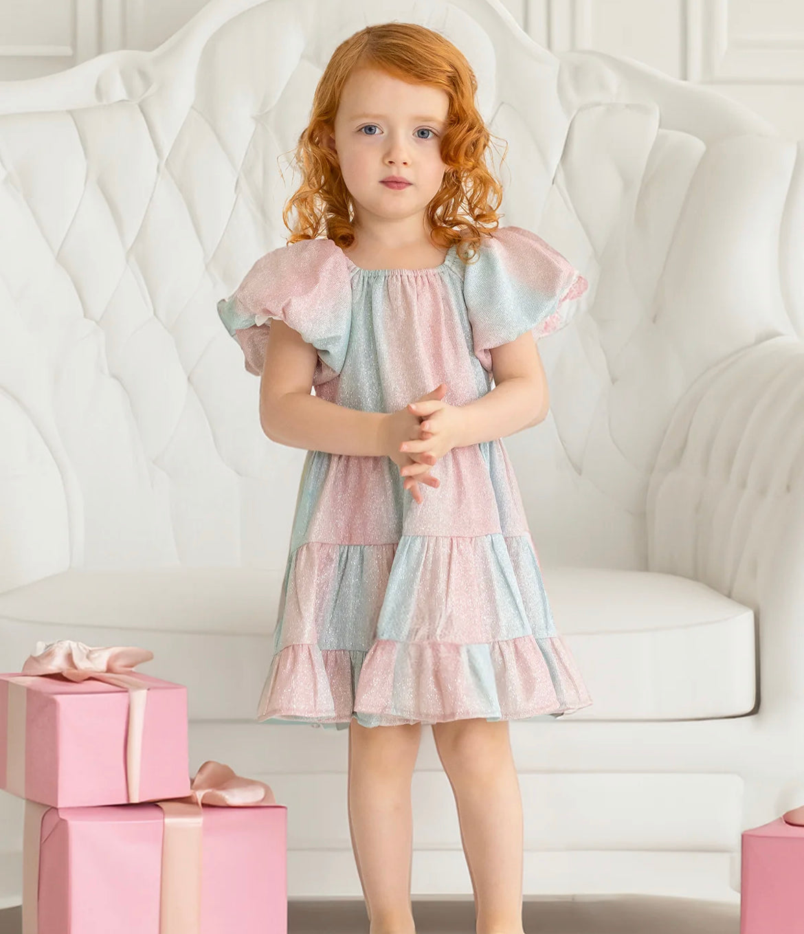This delightful girl's dress is crafted from a sparkling, lightweight fabric that features a stunning gradient of pastel pink and blue. The dress is designed with a tiered, A-line silhouette that flows beautifully with every movement. Puff sleeves add a touch of whimsy, while the shimmery texture ensures she?ll stand out on any occasion. Perfect for special events or adding a bit of magic to everyday wear.