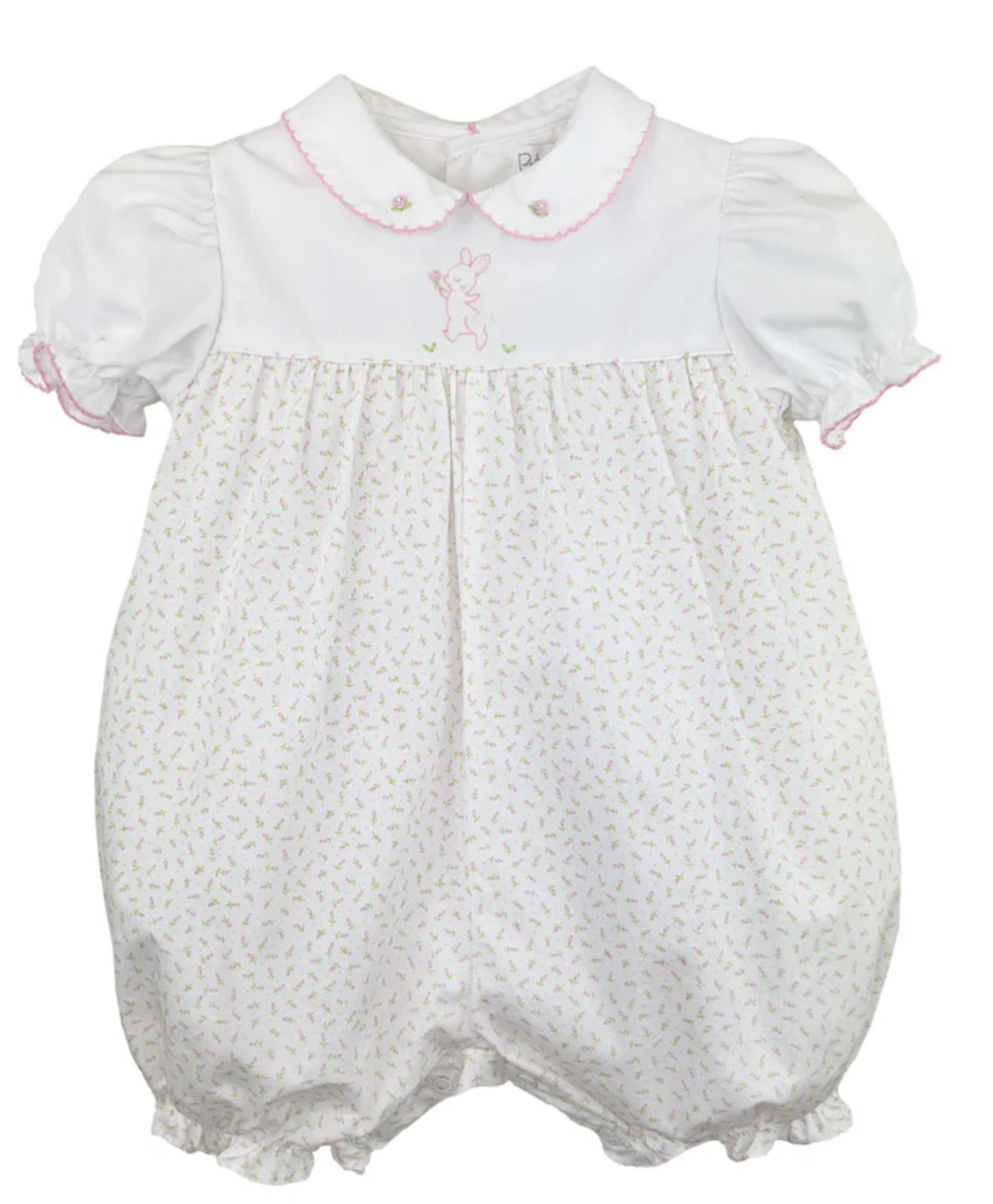 This simple yet sweet short sleeve bubble features a shadow stitched bunny design on the front with a peter pan collar and a pastel floral print bottom! A delicate trimmed edge adds just the right amount of details.