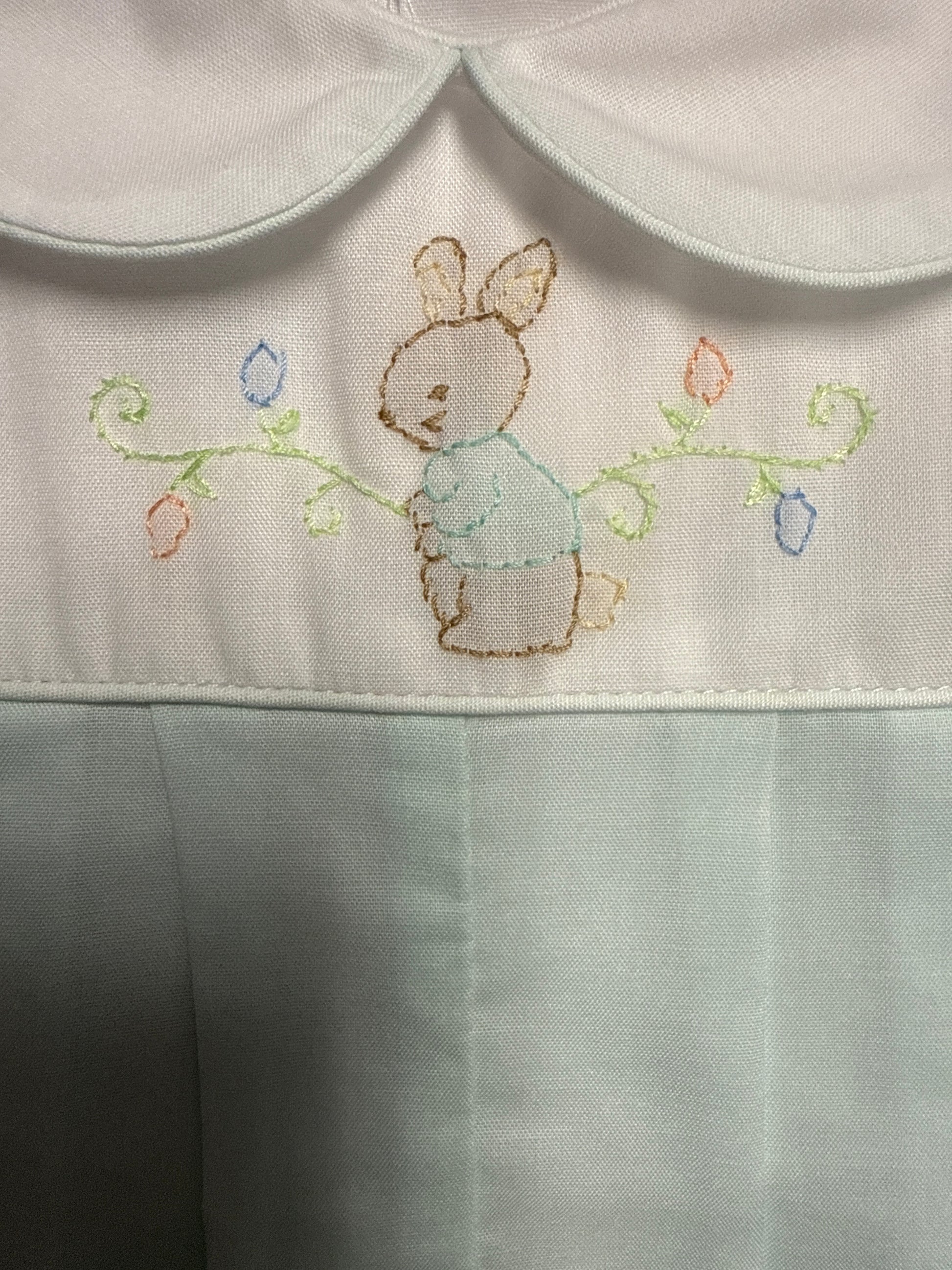 This simple yet sweet short romper comes with a pastel mint green bottom and a white top with a peter pan collar with mint trimmed edges. Features a hand worked shadow stitch embroidered design of an Easter bunny with spring floral details on the front.