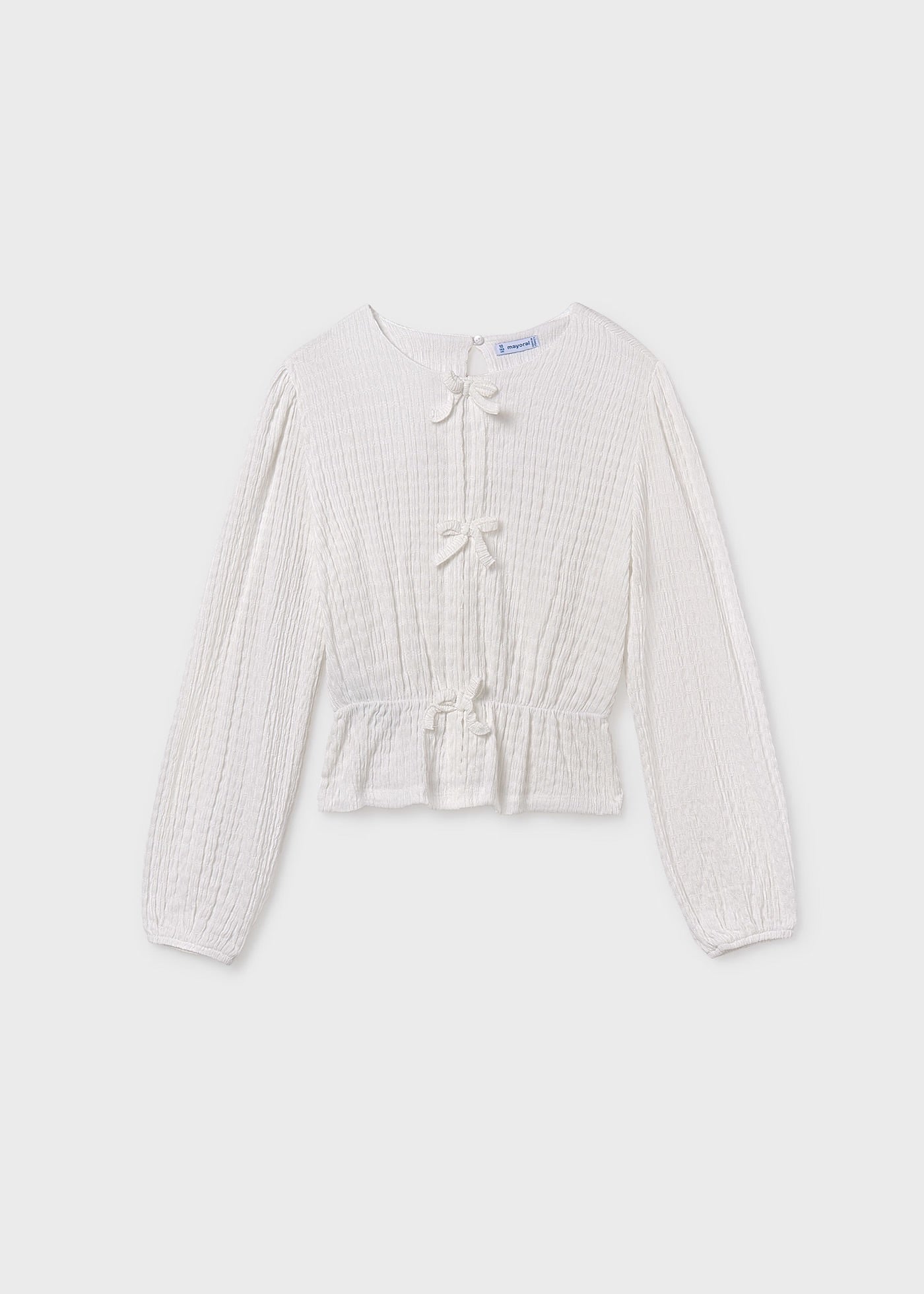 Long sleeved Top for girls. Round neckline. Small opening on the back with a button fastening to allow the garment to be put on easily. Decorative elements: bow appliques.
